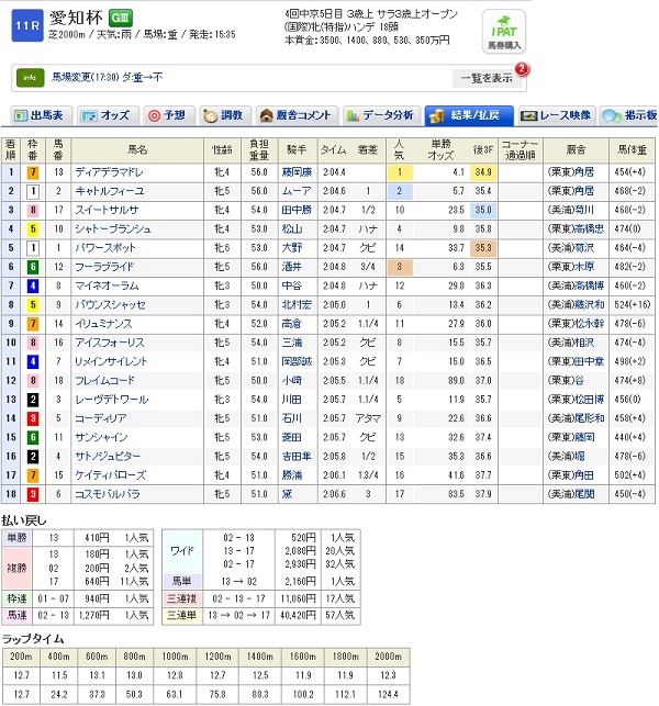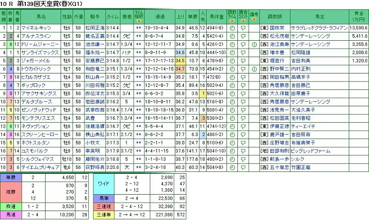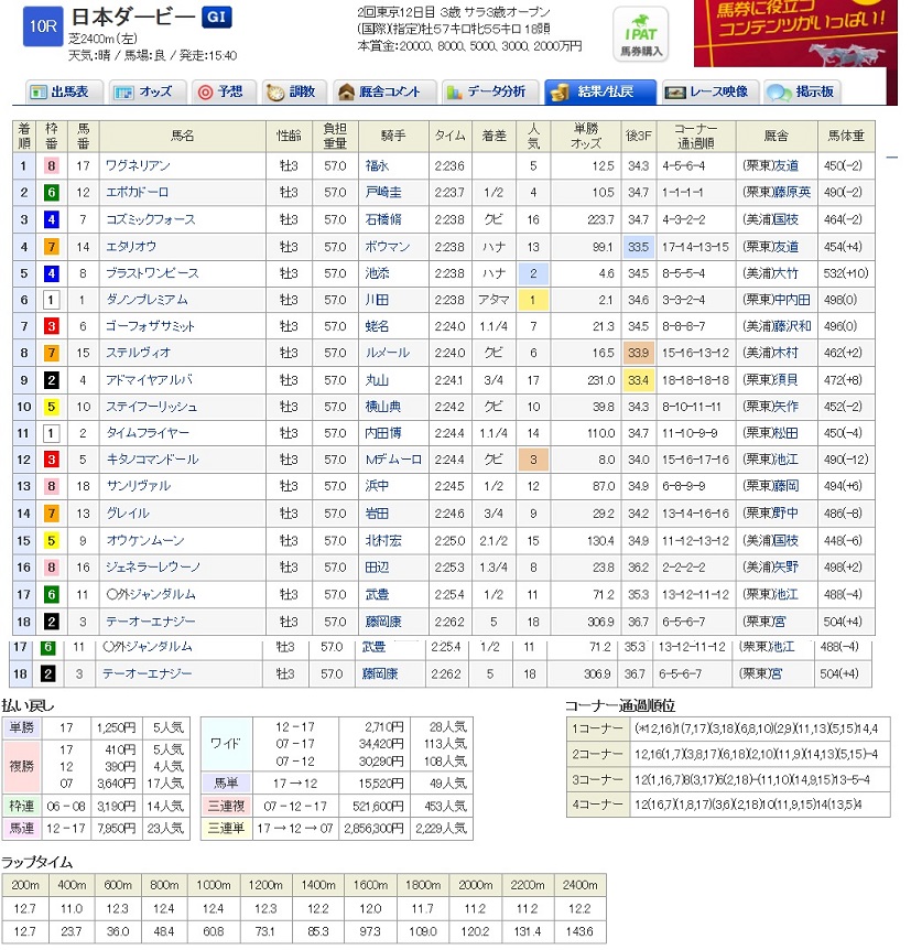 先行有利を予想、単勝223倍のコズミックフォースを指名。ワイドがクリーンヒットし万馬券ゲット。春GIもヴィクトリアM,オークス、ダービーと3連勝 |