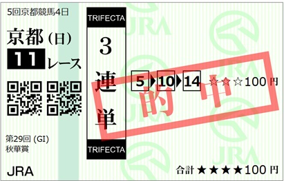2024年秋、GI2週目にて2回目の万馬券。推し続けたボンドガールの素質を信じて3連単を的中。 |